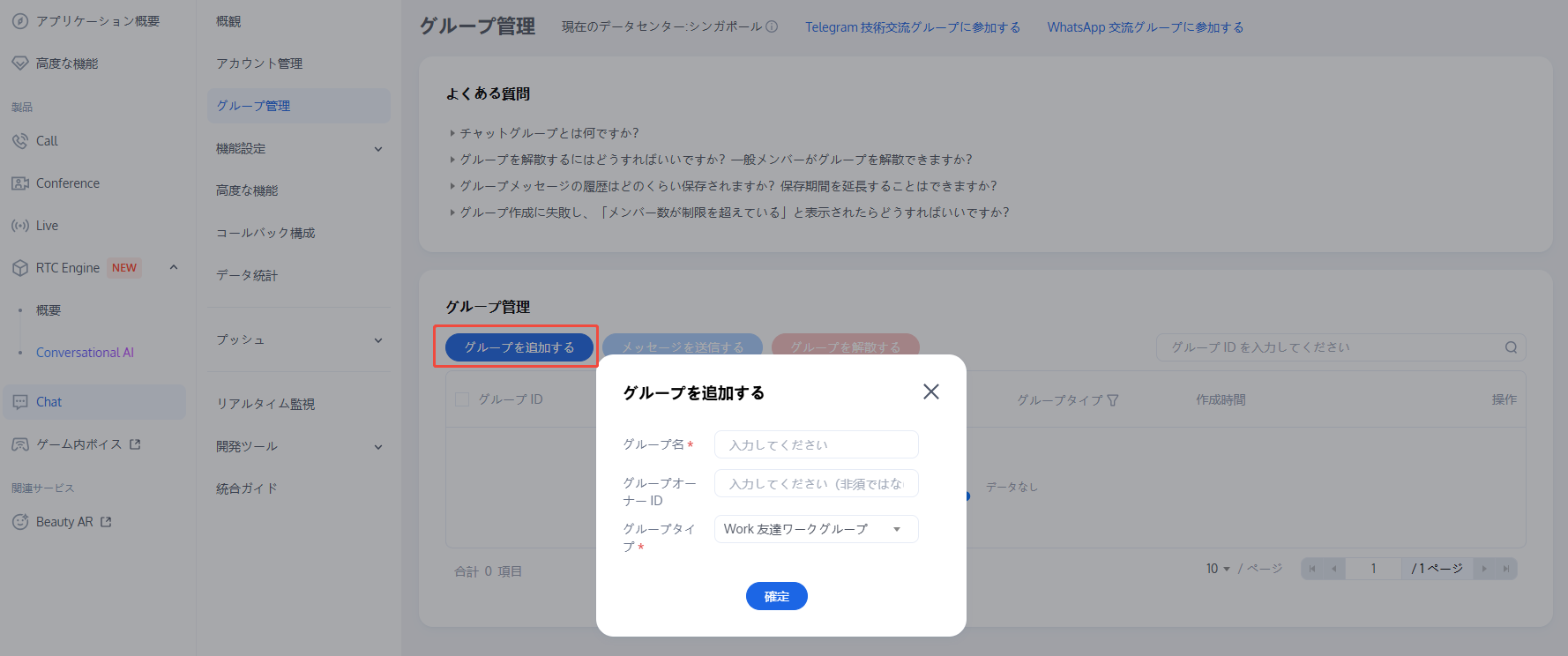 Chatコンソールにログインし、対象のアプリケーションカードをクリックして、左側ナビゲーションバーでグループ管理を選択すると、実際の業務に応じてグループを管理することができます。