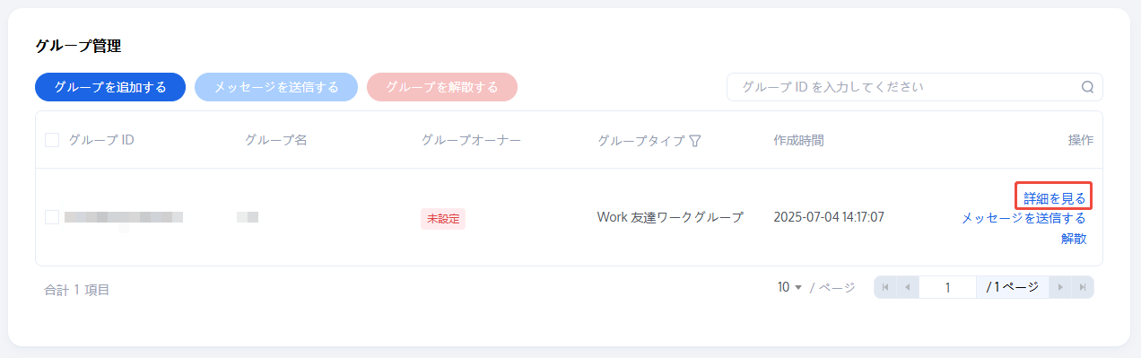 グループの作成が完了すると、グループリストにグループID、グループ名、グループマスター、タイプと作成時間を表示できます。