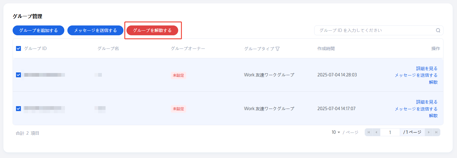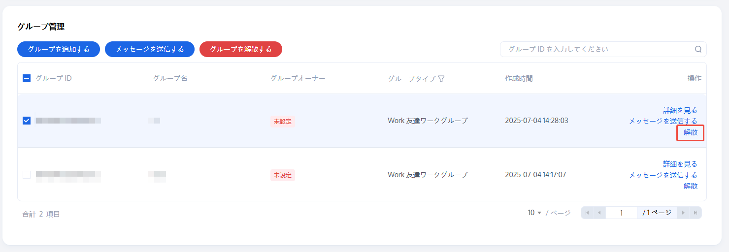 1. グループ管理ページで、次の方法によりグループを解散することができます。