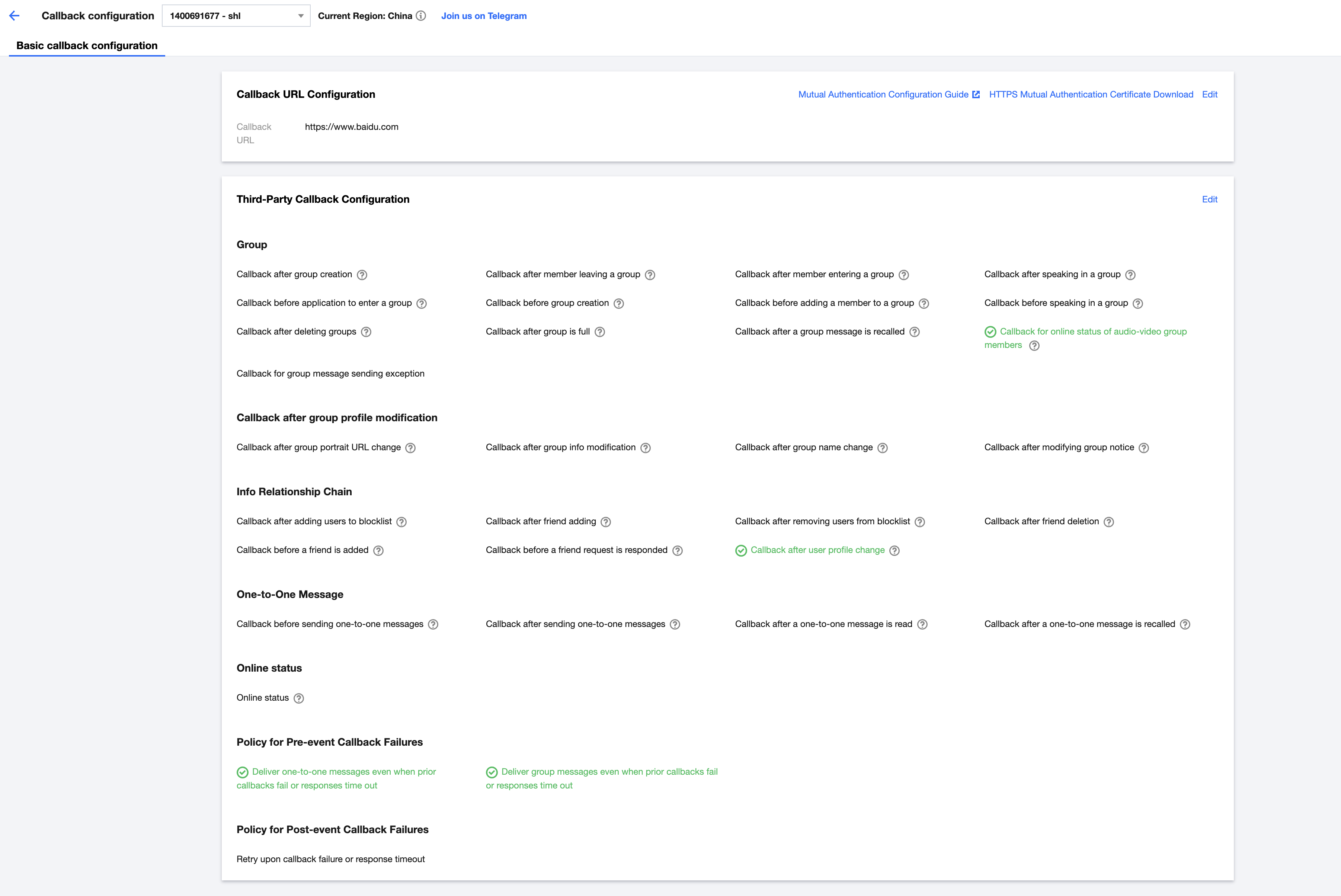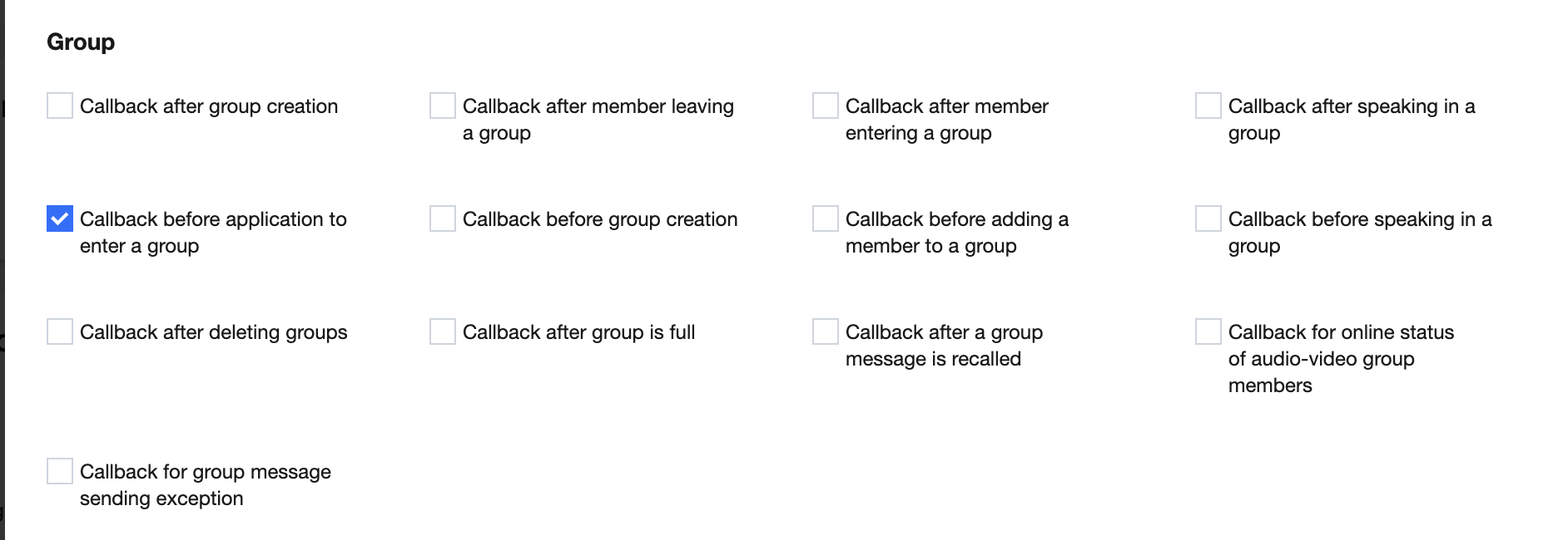 {"CallbackCommand": "Group.CallbackBeforeSendMsg", // コールバックコマンド"GroupId": "@TGS#2J4SZEAEL", // グループID"Type": "Public", // グループタイプ"From_Account": "jared", // 送信者"Operator_Account":"admin", // リクエストの送信者"Random": 123456, // 乱数"OnlineOnlyFlag": 1, //オンラインメッセージは1、そうでない場合は0となります。ライブストリーミンググループの場合はこの属性を無視し、デフォルト値の0とします。"MsgBody": [ // メッセージボディです。TIMMessageのメッセージオブジェクトをご参照ください{"MsgType": "TIMTextElem", // テキスト"MsgContent": {"Text": "red packet"}}],"CloudCustomData": "your cloud custom data"}
