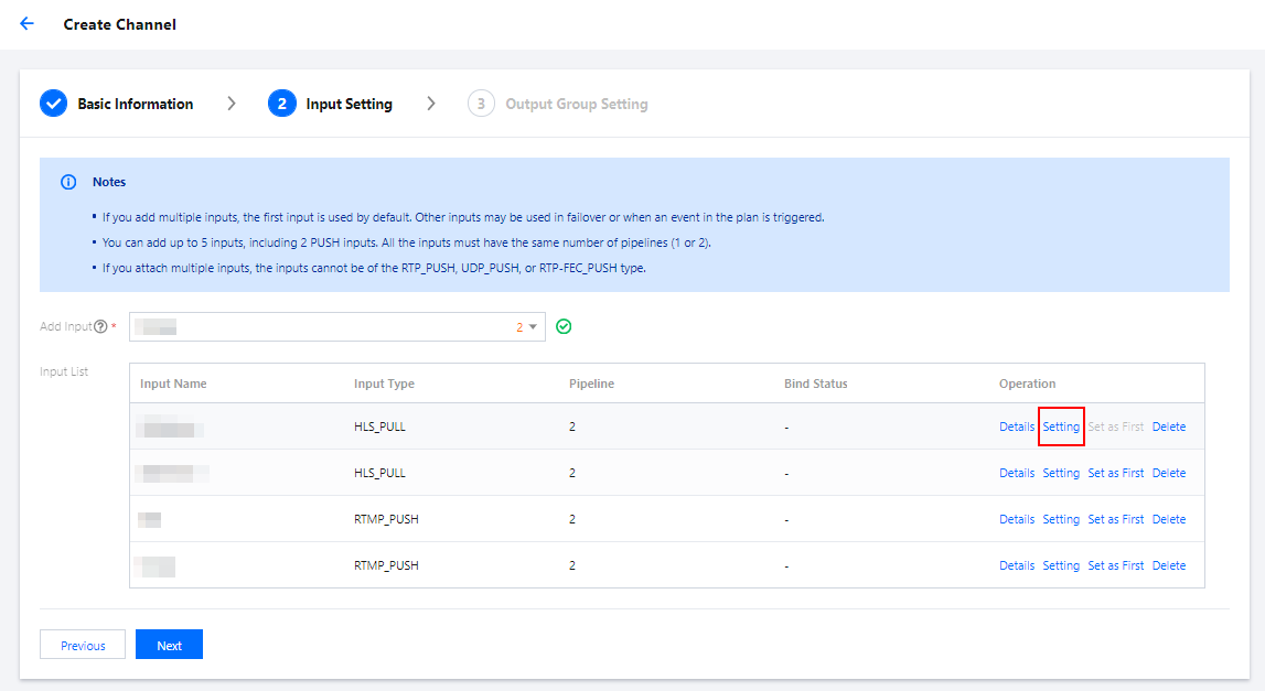 Input Listに追加されたInputが表示されます。特別な構成タイプを必要とするInputの場合、以下に示すように、Settingを選択して関連する設定を行うことができます。