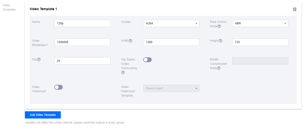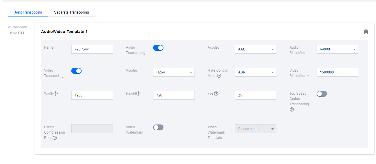 トランスコーディングテンプレートは、組合せ式オーディオビデオのトランスコーディングおよび分離式オーディオビデオのトランスコーディングをサポートします。実際のニーズに応じて選択できます。主な違いは、HLS出力の場合、分離式オーディオビデオのトランスコーディングが複数のオーディオトラック(マルチオーディオ)の自由な組み合わせとマッチングをサポートできることです。そのようなニーズがない場合は、組合せ式オーディオビデオのトランスコーディングテンプレートを使用することをお勧めします。