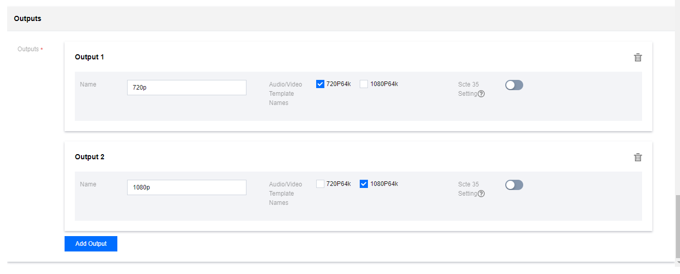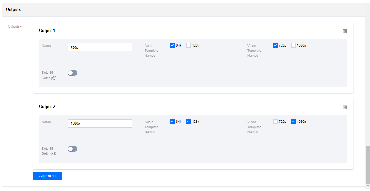 分離式トランスコーディングテンプレート出力を使用する場合は、各Outputは、1つのビデオトランスコーディングテンプレートと複数のオーディオトランスコーディングテンプレートを選択できます。ビデオトランスコーディングテンプレートは、マルチビットレート出力のトランスコーディングギアの1つです。オーディオトランスコーディングテンプレートは、このトランスコーディングギアと一致させることができるオーディオトラック(オーディオ)です。