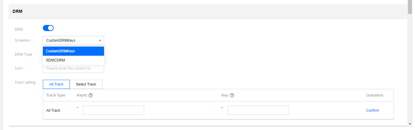 Tencent Cloud StreamLiveは、ユーザー定義のキー(CustomDRMKeys)とSDMCDRMをサポートするDRM暗号化の有効化をサポートします。実際のニーズに応じて選択できます。具体的な使用方法については、DRM設定ドキュメントをご参照ください。 トランスコーディングテンプレートの設定