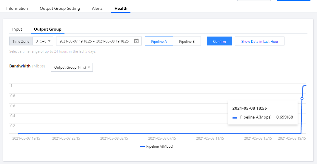 はユーザーに対し、チャネル入力(帯域幅・入力ビデオフレームレート・入力オーディオフレームレート)と出力(帯域幅)の情報および対応するグラフを提供して、現在のチャネルが正常に機能しているかどうか判断します。データクエリーは過去5日間のみクエリーを実行でき、クエリー期間は24時間未満です。