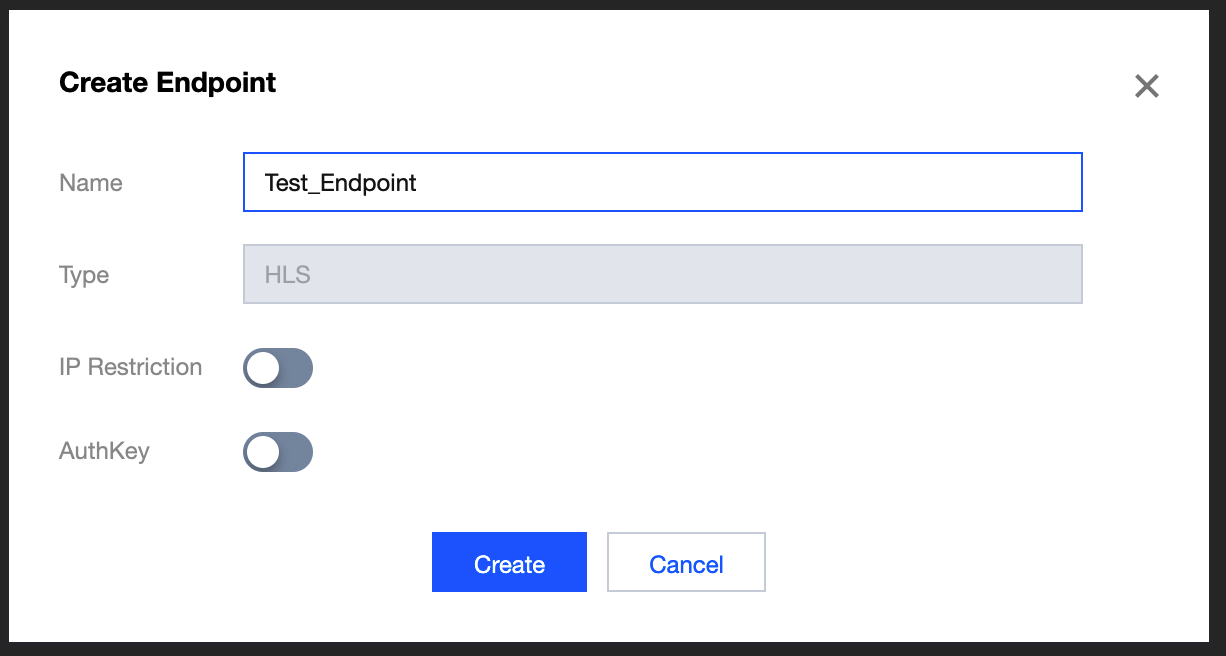 5. Endpoint:Endpointタブに進み、Create Endpointをクリックしてback-to-originプルノードアドレスを作成します。ここでは、IPブラックリスト/ホワイトリスト(IP Restriction)、認証キー(AuthKey)という2つのアクセス方法をサポートしています。Channel作成の際にHLSプロトコルを選択しているため、システムもHLSのback-to-originアドレスを生成します。このアドレスは実際にはmain.m3u8の完全なパスです。