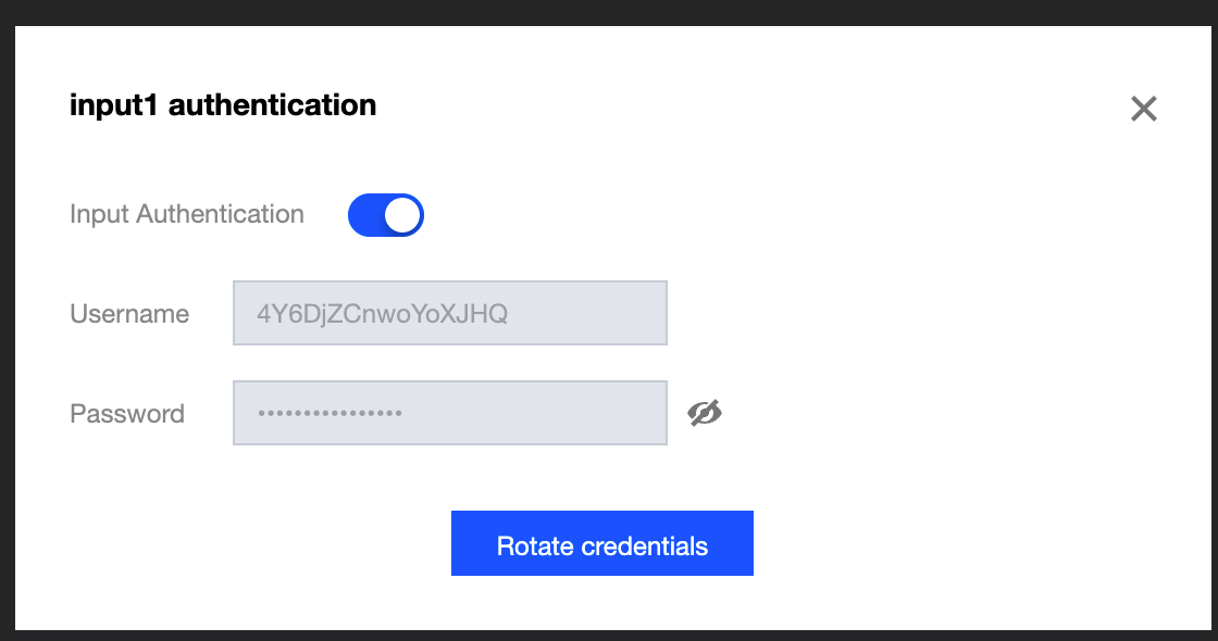 このうち、各Inputには独立したアクセス認証情報を設定することができます。Input Authenticationスイッチをオンにすると、システムは1組のUsername / Passwordを自動的に作成します。ここに挿入
