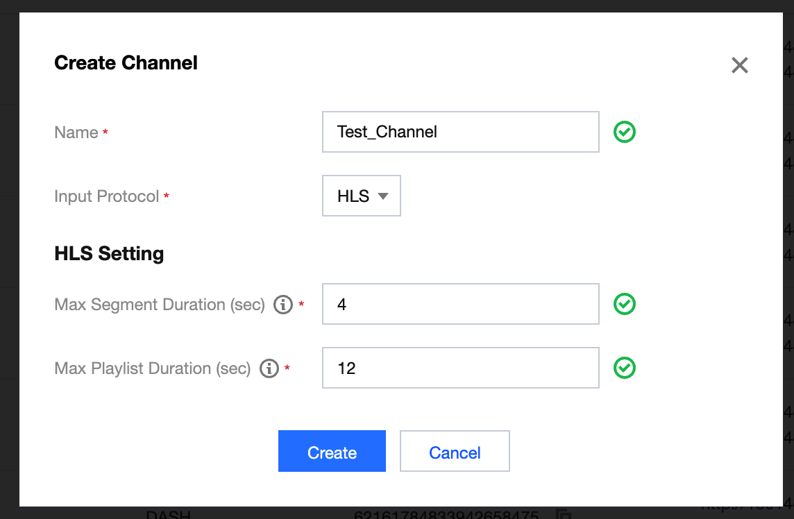 Max Playlist Duration:このチャネルにプッシュするHLSストリームのm3u8再生リストファイルの最大時間を表します。推奨設定は12秒、すなわちm3u8に3つのセグメントが含まれることになります。