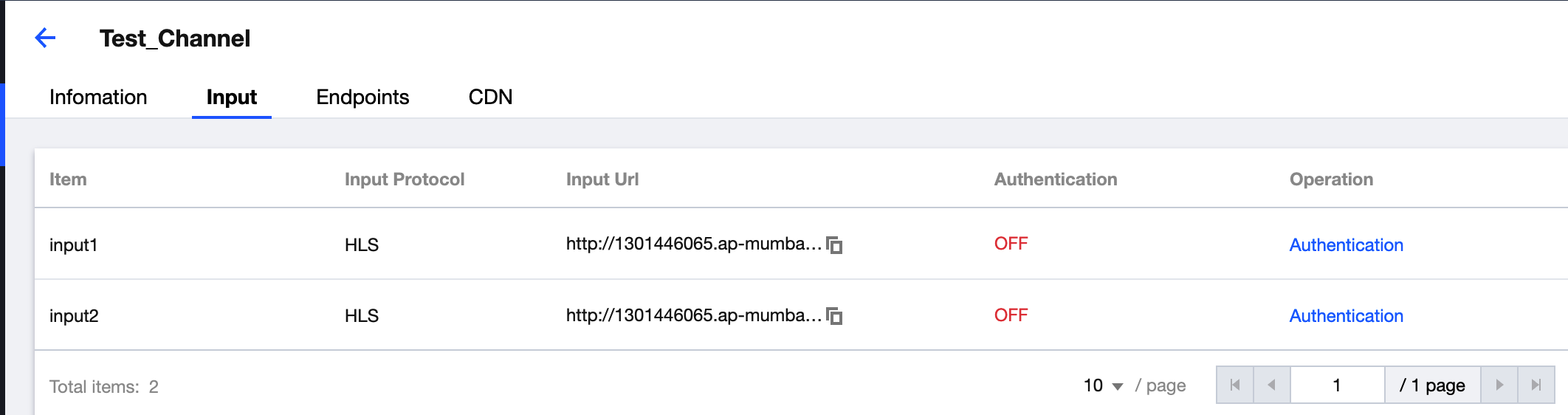 3. 必要な設定情報を送信すると、自動的にチャネルの高度な設定ページに進みます。設定情報はInformationに表示され、その中のライブストリーミングプッシュアドレスInput、back-to-originプルストリーミングアドレスEndpointsおよびCDNアクセラレーションについて、さらに設定を行うことができます。