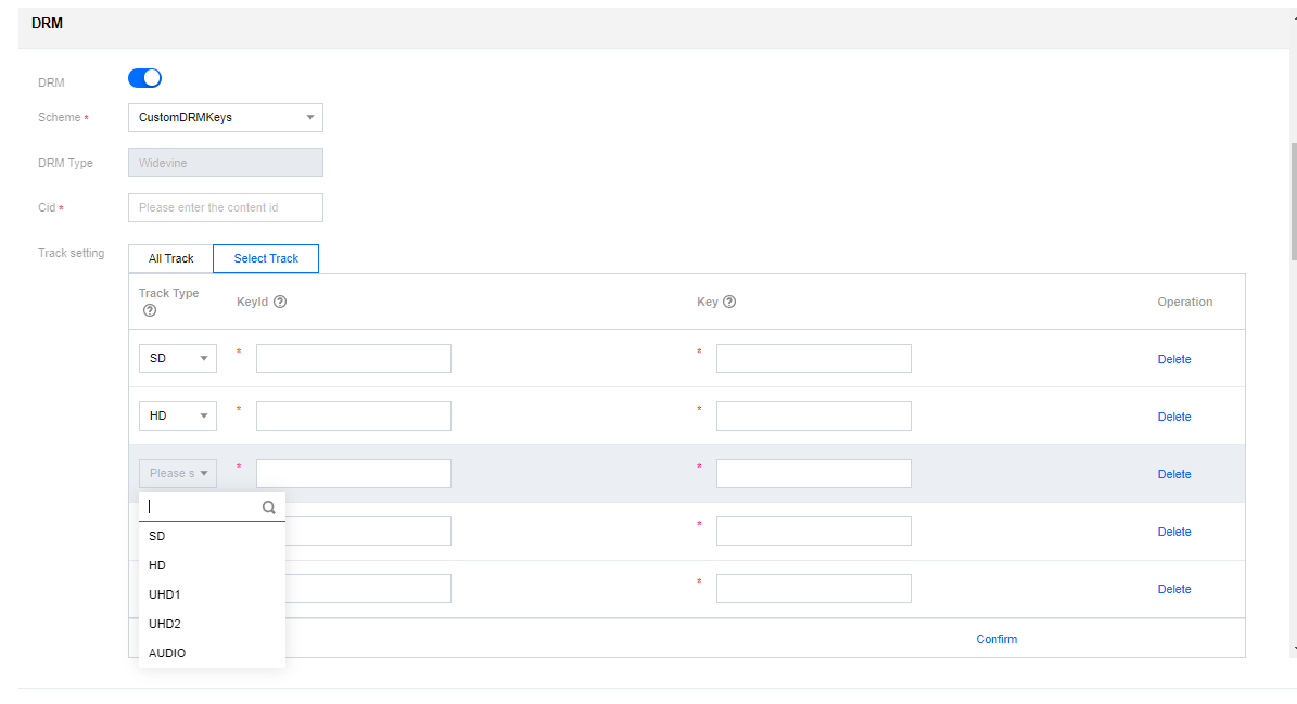 WidevineはAUDIO、SD、HD、UHD1、UHD2という5タイプのTrackをサポートしています。各TrackにはそれぞれKeyIdとKeyを単独で設定できます。ご使用のDRMシステムがTrackのタイプごとにキーを提供していないか、または同一のキーを使用している場合は、All Track統一設定を使用できます。