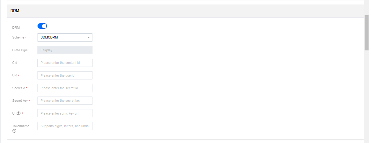 Tokenname:SDMC DRMキーのアドレスをリクエストする際のToken名(オプション)であり、SDMC DRMから提供されます。入力しない場合はデフォルトで'token'を使用します。