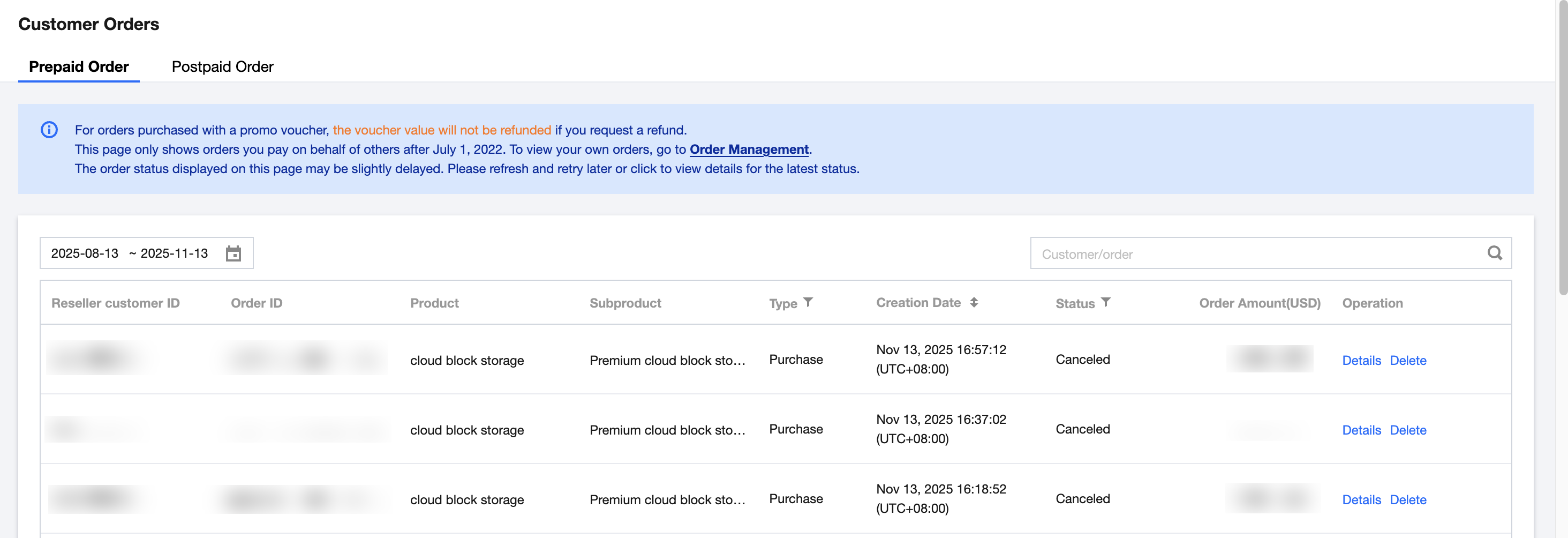 Prepaid orders: You can click Details in the operation column to view. For orders with "order placed to be paid," partners can initiate payment on behalf or cancel the order.