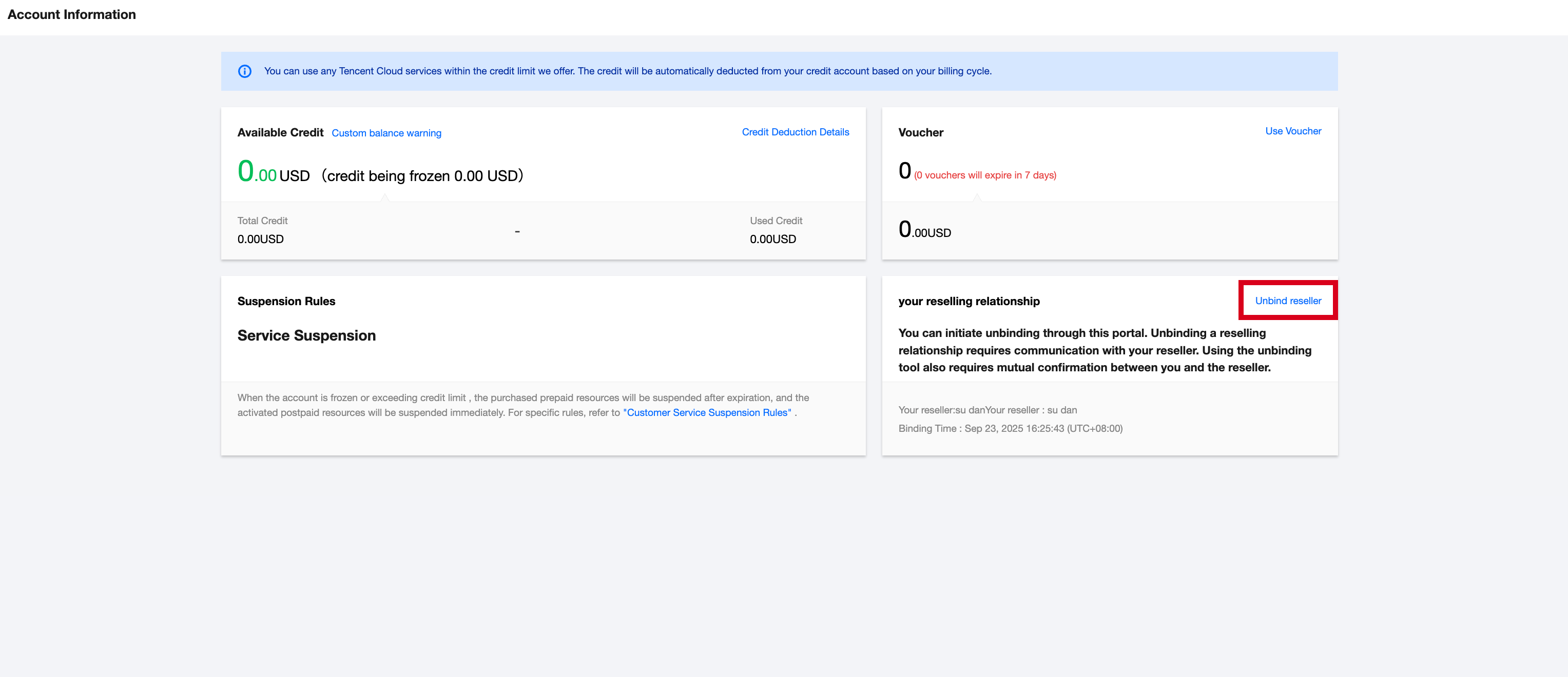 4. Your account has been frozen by the reseller. You can confirm this in the sub-customer console-Billing Center-Account Info. It must be unfrozen before initiating unbinding.