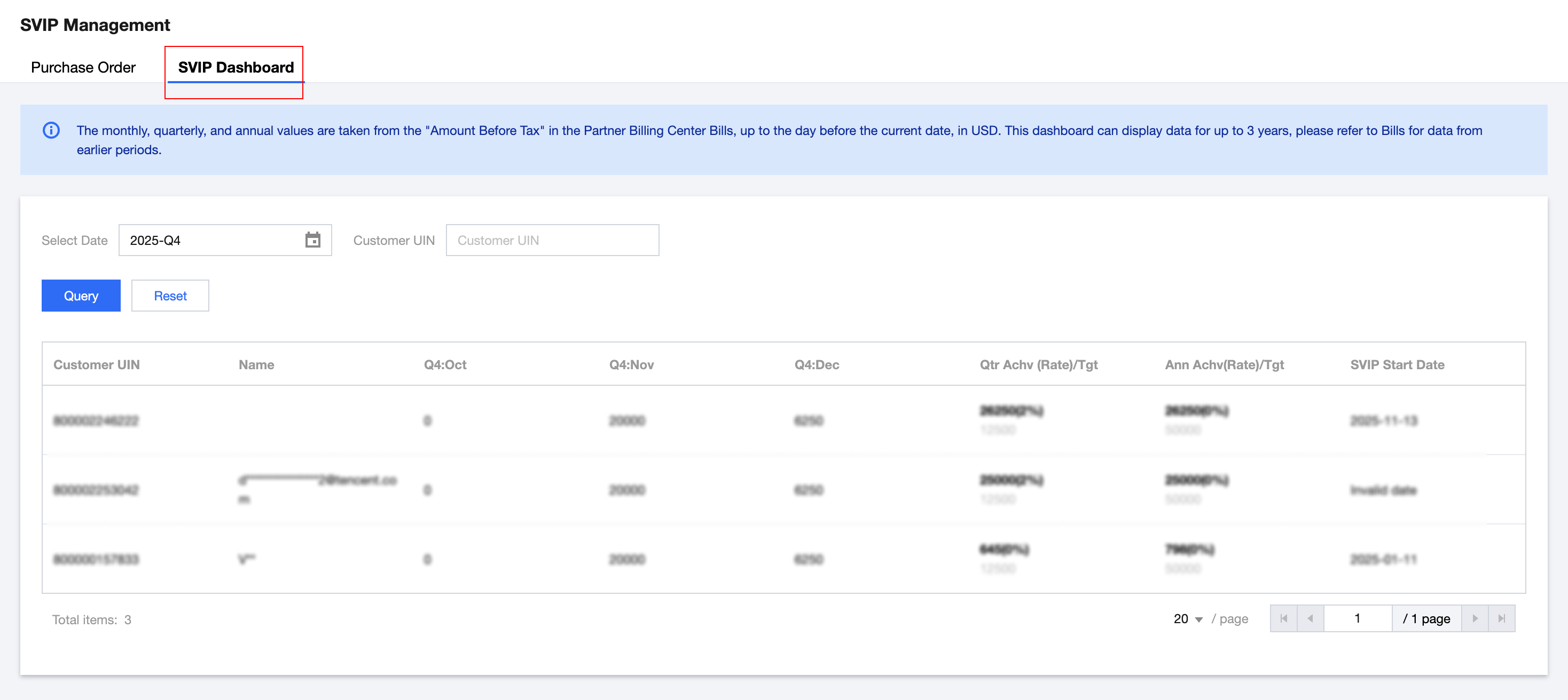 2. In the left menu, choose Customer > SVIP Management, and switch to the SVIP Dashboard tab. This page displays the performance data of customers whose Purchase Order has been confirmed by the partner. It defaults to displaying data for the current quarter and can be queried by quarter and customer UIN. Note: