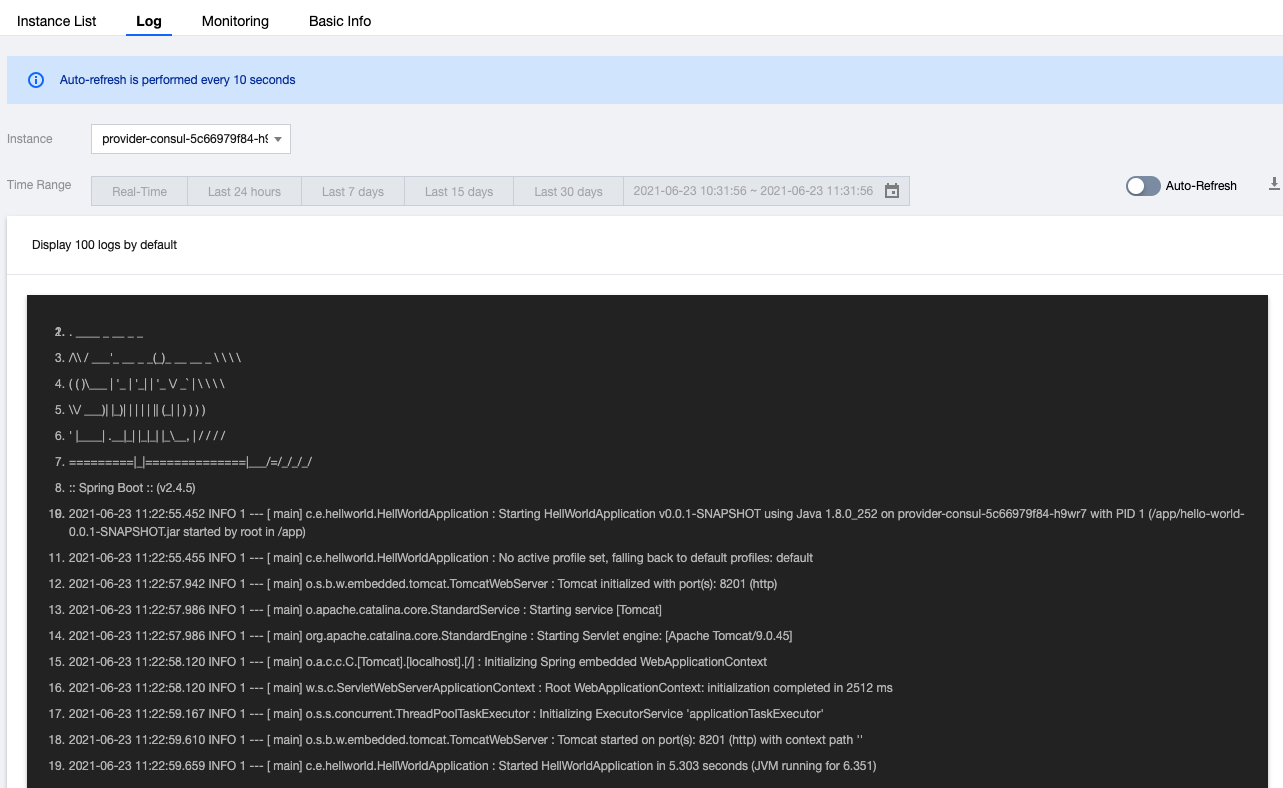 3. アプリケーション詳細ページのログでは、現在のアプリケーション下の(リアルタイム、直近24時間、直近7日、直近15日、直近30日、または自分でフィルタリングした特定の時間の)ログ情報を確認することができます。