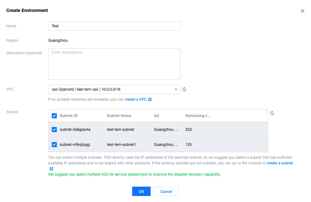 1. TEMコンソールにログインし、左側のナビゲーションバーで環境管理をクリックします。 2. 環境管理ページで、デプロイリージョンを選択してから、新規作成をクリックします。