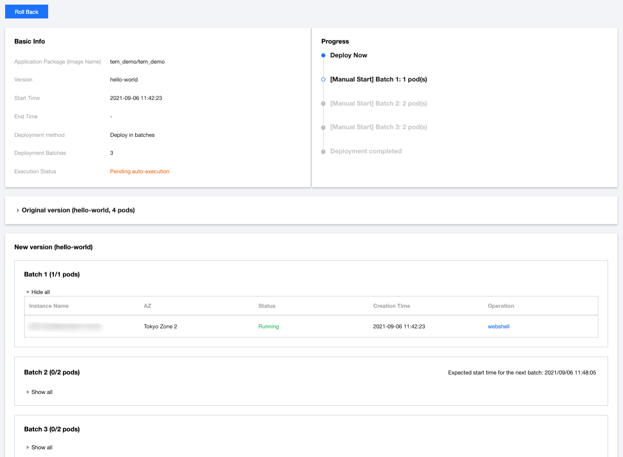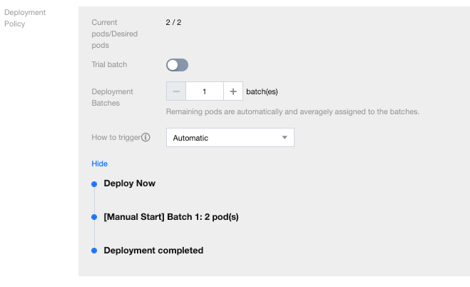 バッチごとのデプロイ機能では複数回バッチでのアプリケーションのデプロイをサポートしていますが、各バッチは対応する一部の実行インスタンスにのみ更新を実行します。また、一時停止によりロールバック機能を手動で検証し、リアルタイムに故障の影響およびデプロイプロセスの変動を避けることができます。