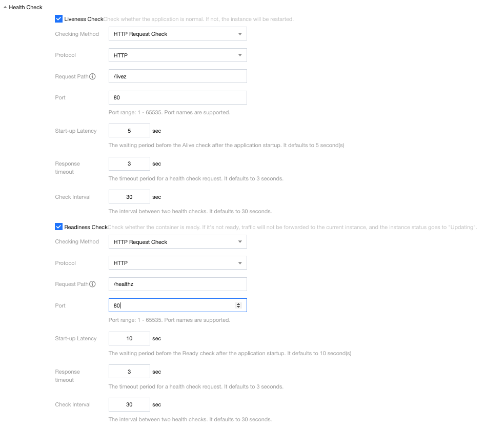 ヘルスチェックとするHTTP APIは存在および完了の2種類のシナリオで使用でき、アプリケーションはリクエストに基づいて、2種類のシナリオのAPIに応じて個別に実装されます。以下の記述はそれぞれ/livezおよび/healthz表記に分かれます。