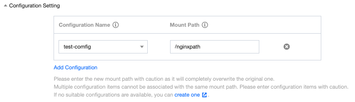 設定をアプリケーションに関連付け:アプリケーションの作成とデプロイを参照して、アプリケーションのデプロイページの設定の構成で、設定項目にContainer Servicesへのマウントのパスを設定します。