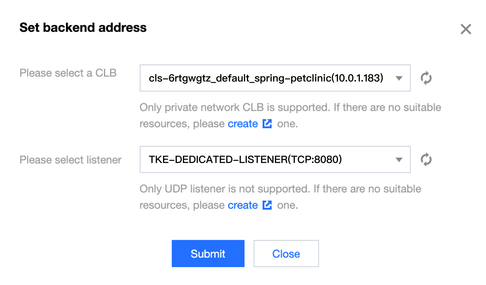3. VPCプライベートネットワークアクセス(第4層に転送)を選択し、サブネット、プロトコル、コンテナポートおよびアプリケーション監視ポートを選択し、サブミットをクリックします。このとき、TEMは第4層に転送するVPCプライベートネットワークアプリケーションタイプのCLBを自動的に作成します。