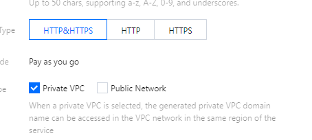 サービスを新規作成する際、フロントエンドのタイプはHTTP、HTTPS、HTTPとHTTPSのいずれかから選択することができます。アクセスモードはVPCプライベートネットワークおよびパブリックネットワークを選択できます。インスタンスのタイプは共有型、専用型を選択します。