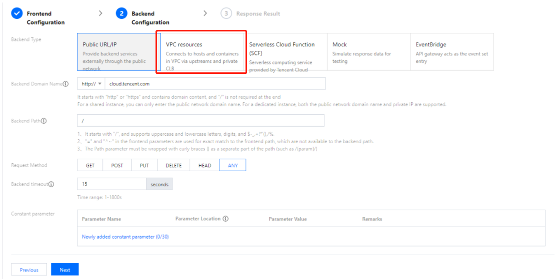 5. バックエンド設定で、VPC内リソースを選択し、TEMアプリケーションのデプロイ環境にあるVPCを選択します。バックエンドドメイン名を設定し、TEMアプリケーションによって自動作成されたCLB(名前は「cls-xxxdefault{TEMアプリケーション名}」)を選択し、対応するリスナー(前の手順で設定したポートのマッピング)を選択します。バックエンドアドレスを「/」と入力し、APIの作成を完了します。