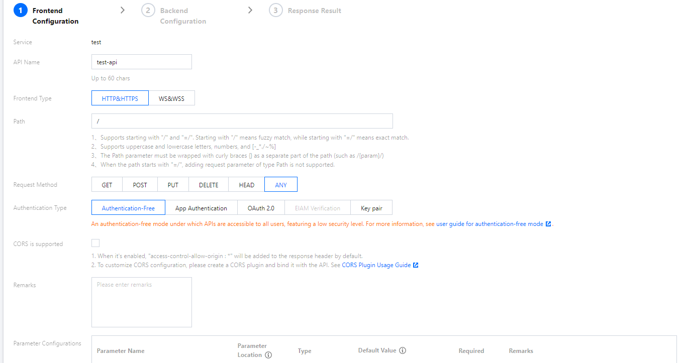 4. フロントエンド設定でAPI名を入力し、フロントエンドのタイプはHTTP&HTTPS、パスは「/」、リクエスト方法はANYを選択してすべてのリクエストが含まれるようにします。 認証のタイプは「認証なし」を選択し、次のステップをクリックします。