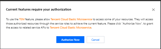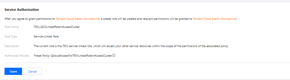 TEMを初めて使用する際は、次の手順に従って、TEM_QCSLinkedRoleInAccessClusterサービスロール、TEM_QCSLinkedRoleInTEMLogサービスロールをそれぞれ作成し、他のクラウド製品リソースへのアクセス権限を承認する必要があります。