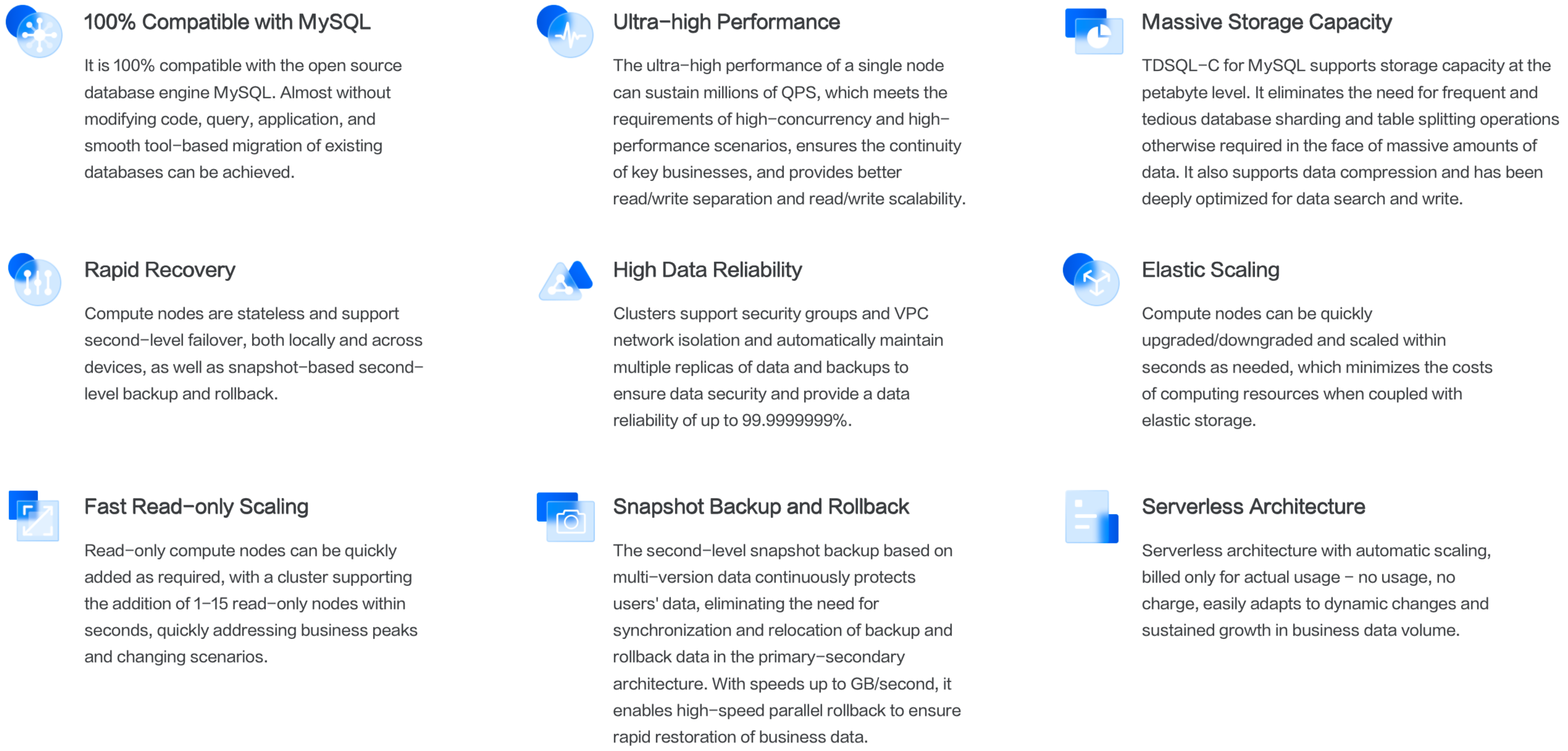 スケーラビリティ | ✅ 伸縮性スケールアウトをサポートしています。 | ✅ 伸縮性スケールアウトをサポートしています。 | 伸縮性スケールアウトをサポートしていません。 |
