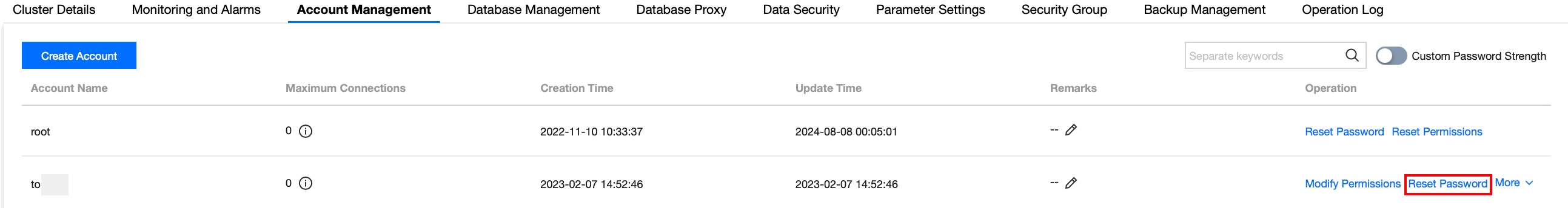 3. クラスタ管理ページでアカウント管理ページを選択し、操作列のパスワード再設定をクリックします。