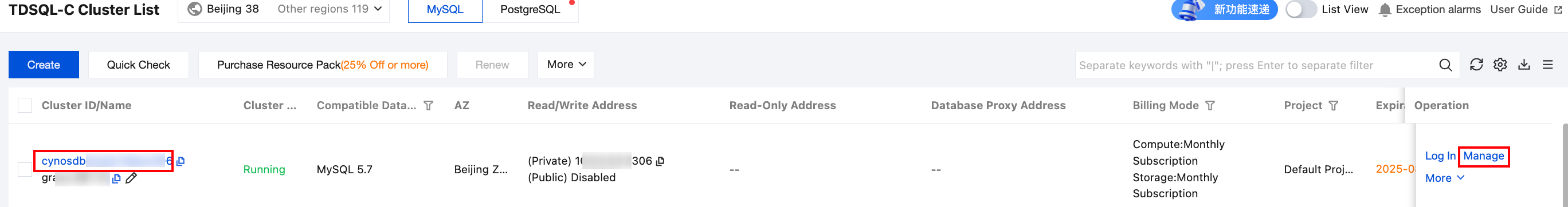 左側のクラスタリストでターゲットクラスタを見つけ、クラスタIDまたは操作列の管理をクリックすると、クラスタ管理ページに移動します。