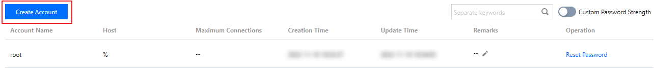 ホスト | データベースにアクセスするためのホストアドレスを指定します。IP形式に対応しており、%の入力も可能です。複数のホストは区切り文字で分離され、区切り文字として以下が利用可能:;、,、|、改行、空格 例1:%を入力すると、IP範囲制限を行わないことを示し、すべてのIPアドレスのクライアントがこのアカウントを使用してデータベースにアクセスすることを許可します。 説明: ホストに%を入力すると、アカウントのセキュリティリスク(悪意のある接続やブルートフォース攻撃など)が発生する恐れがあります。データベースへのアクセスには具体的なホストアドレスを指定することを推奨します。 例2:10.5.10.%を入力すると、IP範囲が10.5.10.%内にあるクライアントがこのアカウントを使用してデータベースにアクセスすることが許可されることを意味します。 |