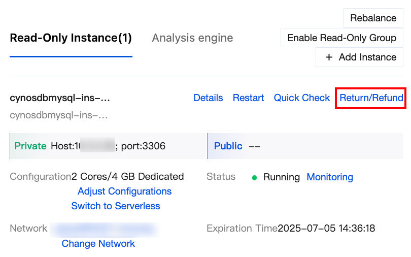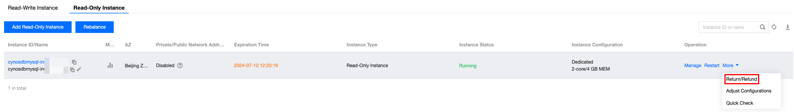 2. クラスタ管理ページで、インスタンスリストタブを選択し、削除する必要がある読み書きインスタンスまたは読み取り専用インスタンスを見つけ、その他 > 返金/払い戻しを選択します。