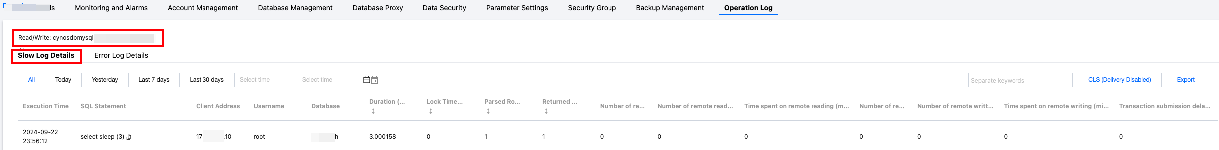 3. クラスタ管理ページで、操作ログタブを選択し、ターゲットインスタンスを選択後、スローログ詳細をクリックします。