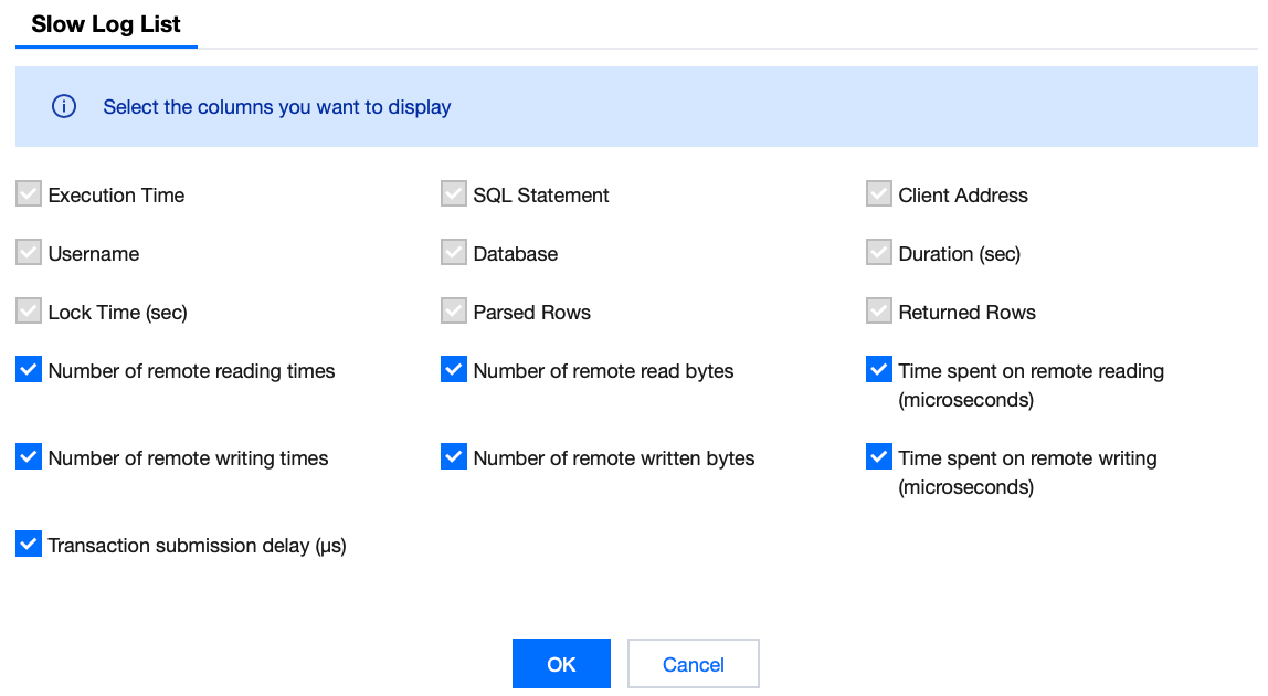 リモート読み取り回数、リモート読み取りのバイト数、リモート読み取りにかかった時間(ナノ秒)、リモート書き込み回数、リモート書き込みのバイト数、リモート書き込みにかかった時間(ナノ秒)、トランザクションコミット遅延(マイクロ秒)の7つのフィールドは、カーネルバージョンがTXSQL 8.0で、カーネルマイナーバージョンが3.1.12以上である必要があります。スローログリストに表示するには、右側の設定アイコンをクリックし、表示したいフィールドにチェックを入れて確認をクリックしてください。