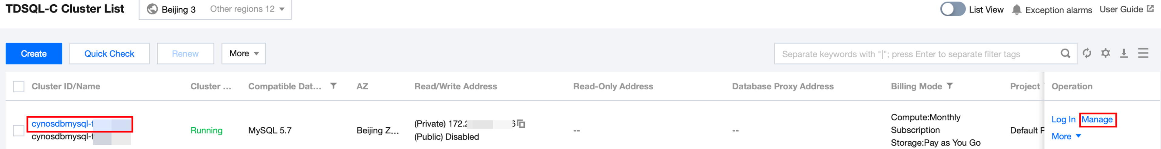 左側のクラスタリストでターゲットクラスタを見つけ、クラスタIDまたは操作列の管理をクリックすると、クラスタ管理ページに移動します。
