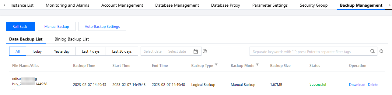 2. クラスタ管理ページで、バックアップ管理 > データバックアップリストを選択し、ダウンロードする必要があるバックアップを見つけ、操作列のダウンロードをクリックします。