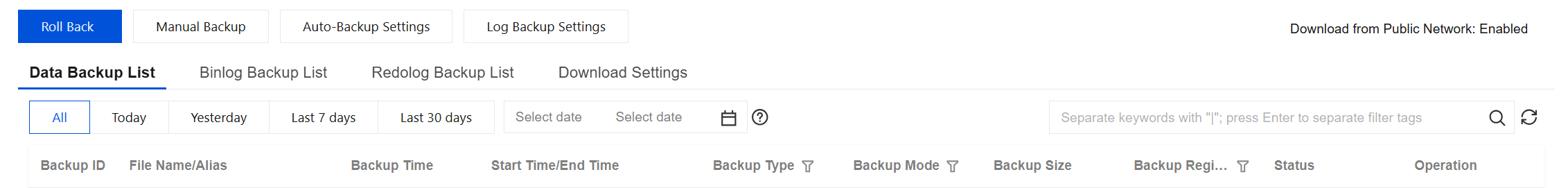 binlogバックアップのサイズはログバックアップリストで照会可能であり、binlogバックアップの総サイズは各binlogバックアップファイルのサイズの合計となります。