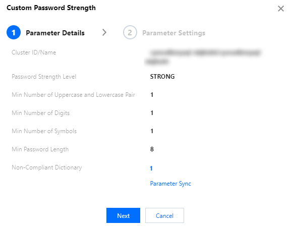 コンソールにサブアカウントでログインしている場合、当該サブアカウントにカスタムパスワード強度のパラメータ同期機能の使用権限が付与されている必要があります。詳細な権限機能名と操作手順については、サブユーザーへの機能権限付与をご参照ください。 クラスタのカスタムパスワード強度機能を有効にした後、パラメータ同期機能を通じて、現在のクラスタに設定されたカスタムパスワード強度パラメータ(禁止語辞書を含む)を、当該Tencent Cloudアカウントで管理されている同一リージョンの他のクラスタに同期できます。同期対象のクラスタで本機能が有効になっていない場合、機能を有効化するとともにパラメータが同期されます。