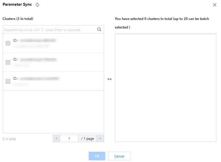 5. パラメータ同期画面で、同期が必要なクラスタを選択し(複数選択可能、選択解除も可能)、OKをクリックします。