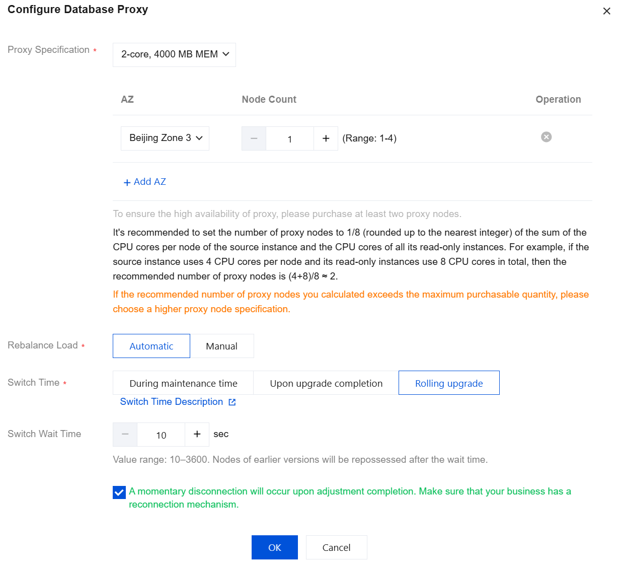 | | 減少 | 自動 | メンテナンス時間内 | 秒単位の瞬断が発生する可能性があります。業務に再接続メカニズムが備えていることをご確認ください。 |