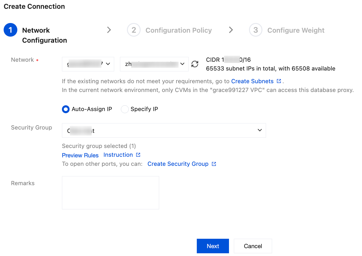 ネットワークタイプ | データベースプロキシのネットワークを選択します。VPCのみサポートされ、IPの自動割り当てまたは指定IPの選択が可能です。 |