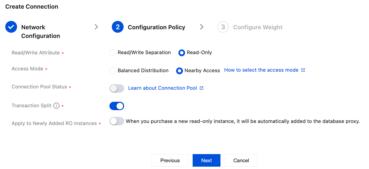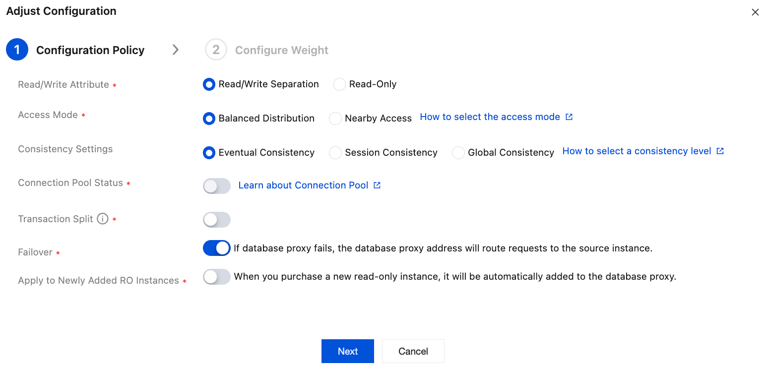 自動で読み取り専用インスタンスを追加する | 設定項目を有効にするかどうかを選択します。有効にした場合、新しい読み取り専用インスタンスまたは読み取り専用分析エンジンを購入すると、データベースプロキシに自動的に追加されます。 リードウェイトがシステムによる自動割り当ての場合、新規購入した読み取り専用インスタンスには仕様サイズに基づいてデフォルトウェイトが割り当てられます。 リードウェイトがカスタム設定の場合、新規購入した読み取り専用インスタンスのデフォルト追加時ウェイトは0です。データベースプロキシページの接続アドレス配下で構成調整を行うことで変更可能です。 |