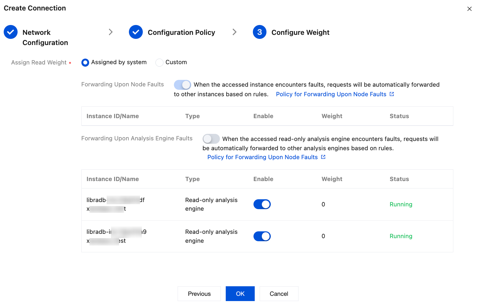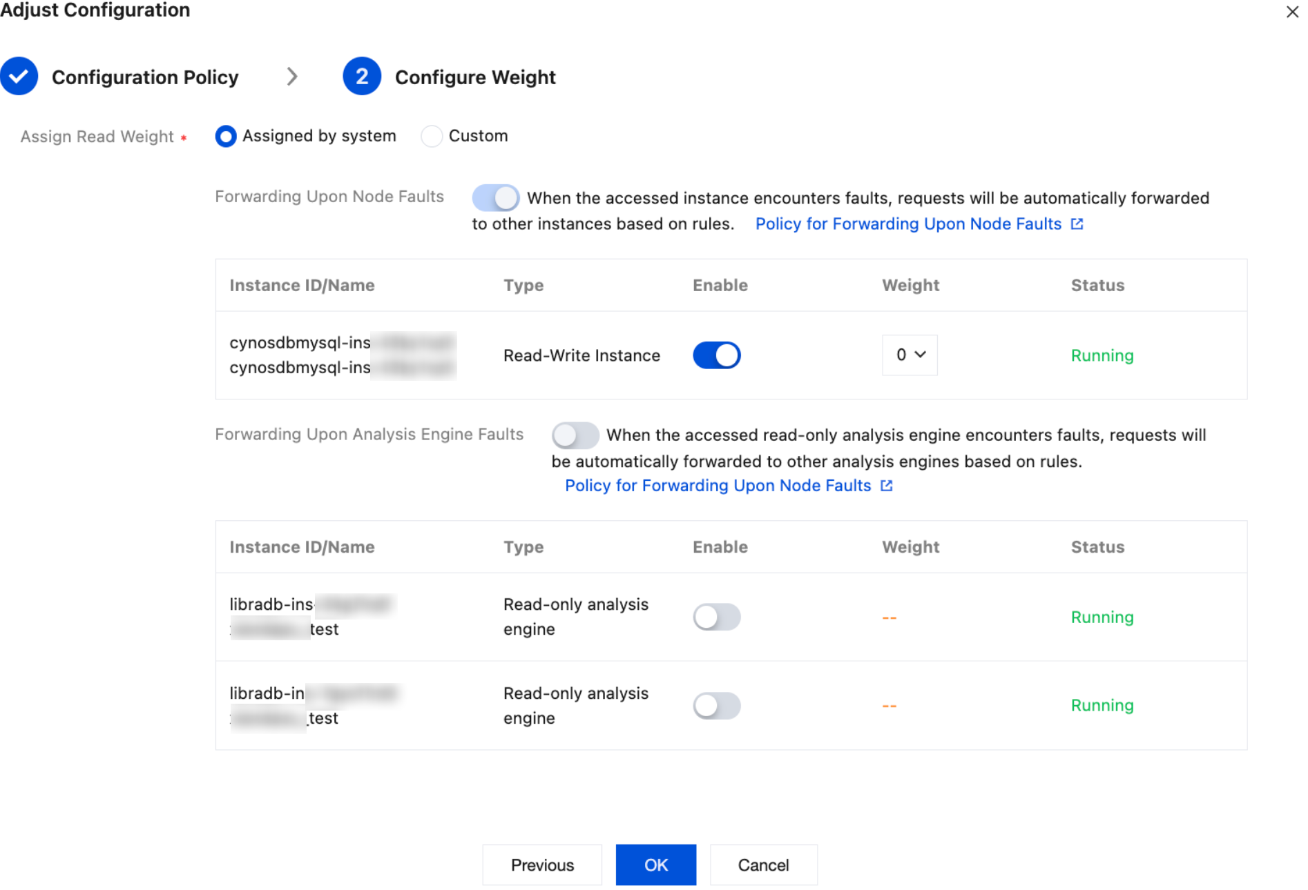 リードウェイト割り当て | データベースプロキシは読み取りリクエストを異なるインスタンスに分散する必要があります。各インスタンスに異なるリードウェイトを割り当てることで、データベースプロキシはインスタンスのウェイト値に基づいてリクエストのルーティング先を決定できます。ここではシステム自動割り当てまたはカスタム設定を選択可能です。 カスタム割り当てを選択した場合、異なるインスタンスによるデータベースへのアクセスウェイトを個別に設定できます。以下はリードウェイト割り当て時に有効になるウェイト関連の説明です: 有効にする:有効にするボタンをオンにすると、選択したインスタンスに接続が割り当てられます。有効にするボタンをオフにすると、選択したインスタンスには接続が割り当てられません。 ウェイト:ウェイト値の範囲は0~100です。0に設定すると、選択したインスタンスに接続が割り当てられ、最小のウェイトとなります。数値が大きいほどウェイトが高くなり、より多くの読み取りリクエストを受信できます。リードウェイト割り当てを設定すると、読み取りリクエストは対応するインスタンスに比例的にルーティングされます。例えば、インスタンス1、インスタンス2、インスタンス3にそれぞれ3、2、1のリードウェイト値を割り当てた場合、データベースプロキシ接続アドレスからの読み取りリクエストは3:2:1の割合で各インスタンスにルーティングされます。 説明: ここのウェイトは、読取リクエスト(非トランザクション)向けウェイトの割り当て戦略です。 読み取り専用分析エンジンはウェイト変更をサポートしておらず、/*to server インスタンスID*/ のヒント構文を使用した強制指定転送実行のみサポートしています。 |