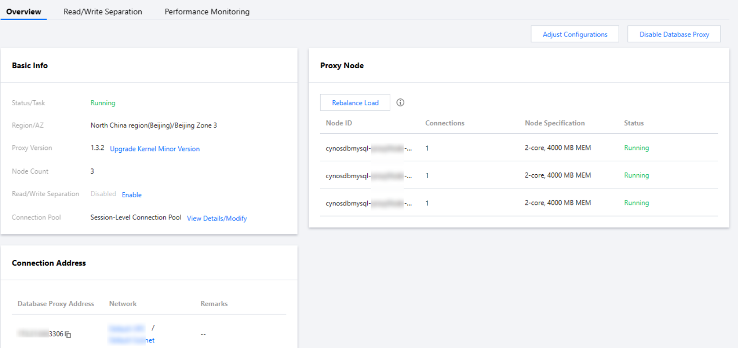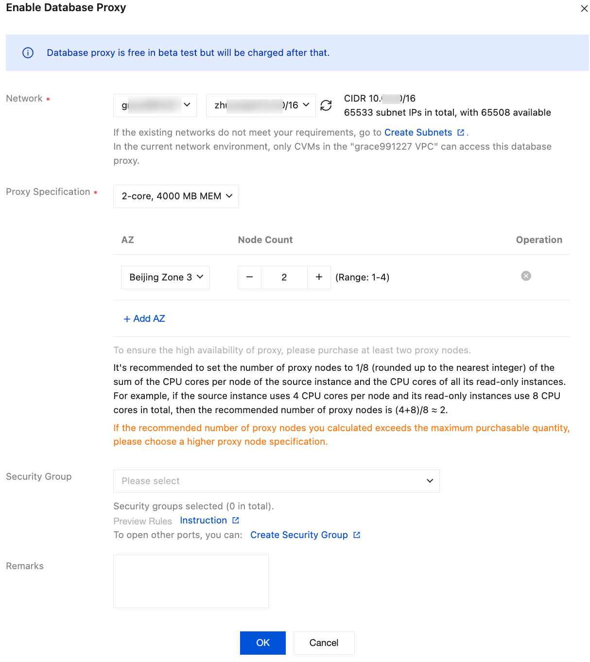 アベイラビリティーゾーンとノード数 | 1. データベースプロキシのアベイラビリティーゾーンを選択します。「アベイラビリティーゾーンを追加」をクリックして複数選択をサポートします。選択可能なアベイラビリティーゾーンの数は、現在のリージョンで利用可能なアベイラビリティーゾーンの数によって異なります。 2. ノード数を選択します。推奨されるプロキシノード数は、プライマリインスタンスと読み取り専用インスタンスのCPUコア数の合計の1/8(切り上げ)です。例えば、プライマリインスタンスが4コア、読み取り専用インスタンスが8コアの場合、推奨プロキシ数 = (4 + 8) / 8 ≈ 2となります。現在のバージョンでは最大4つのデータベースプロキシノードを選択可能ですが、高可用性を確保するためには少なくとも2ノードを選択することを推奨します。 3. クラスタがマルチAZデプロイメントの場合、データベースプロキシの高可用性を確保するため、プライマリおよびスタンバイアベイラビリティーゾーン両方にデータベースプロキシノードを均等に配置することを推奨します。 注意: 選択したデータベースプロキシがプライマリインスタンスと同じアベイラビリティーゾーンにない場合、データベースプロキシ経由で接続すると書き込み性能が低下する可能性があります。 推奨ノード数を計算した結果、必要なプロキシノード数が購入制限を超える場合、より高规格のプロキシを選択することを推奨します。 |
