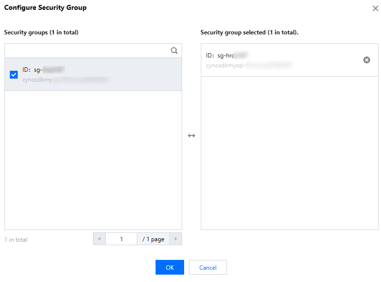 4. セキュリティグループ設定ウィンドウで、セキュリティグループルールを選択します(セキュリティグループIDを検索して必要なセキュリティグループを見つけることも可能です)、確定をクリックします。