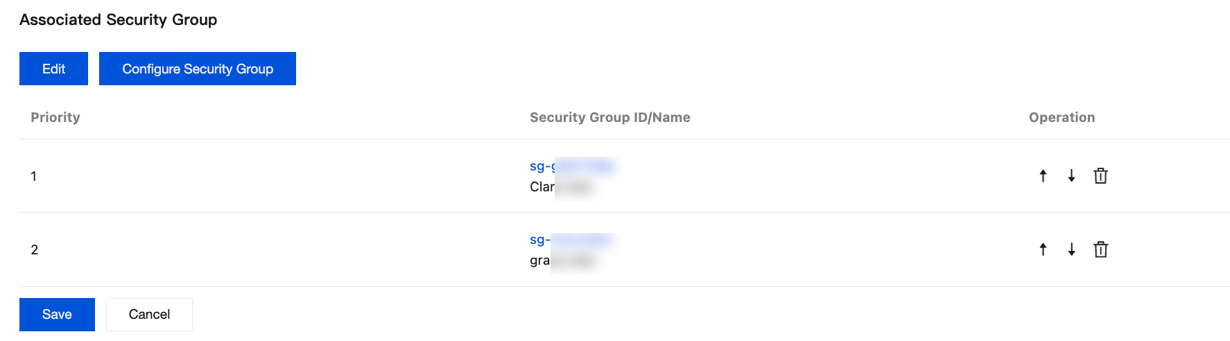 TDSQL-C for MySQLインスタンスが複数のセキュリティグループにバインドされている場合、複数のセキュリティグループは優先度順(例:1、2)に従って順次マッチング・実行され、セキュリティグループの優先度を調整できます。