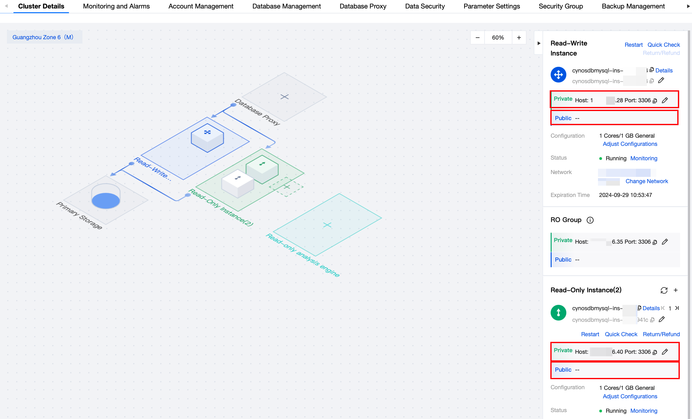 2. クラスタ管理ページで、インスタンスリストページを選択し、読み書きインスタンスまたは読み取り専用インスタンスを選択して、フィールド:内部ネットワーク/外部ネットワークアドレスで対応するインスタンスの内部ネットワーク/外部ネットワークIPアドレスを確認します。
