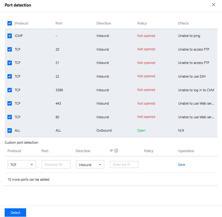 CVMインスタンスのセキュリティグループルールの設定が適切でない場合(例えば、対応するポートを開放していないためLinuxインスタンスにログインできない場合)、セキュリティグループ(ポート)チェックツールを使用して、インスタンスの現在のセキュリティグループ設定の接続性を確認できます。 ワンクリック診断によりログイン失敗の可能性のある原因を把握できます。