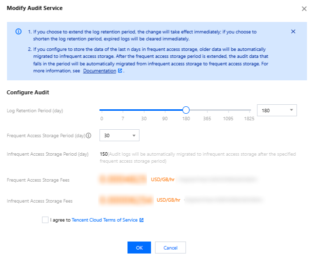 5. 監査サービス変更ウィンドウで、ログ保存期間または高頻度ストレージ保存期間を変更した後、確認をクリックします。
